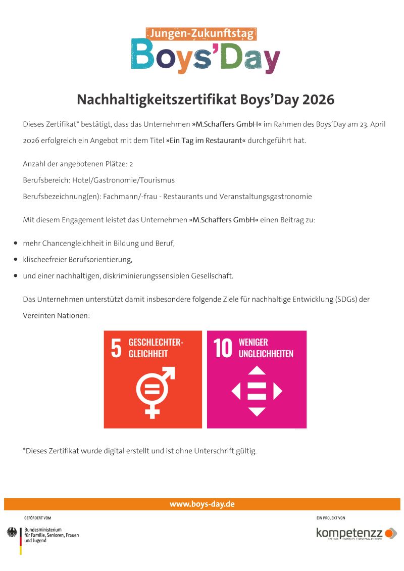 Am Boys’Day 2026 haben wir Schülern einen Einblick in unseren Hotel- und Restaurantalltag ermöglicht. Dabei konnten sie kennenlernen, wie vielseitig die Arbeit in der Gastronomie ist – vom Service über den Umgang mit Gästen bis hin zur Organisation im Hintergrund.